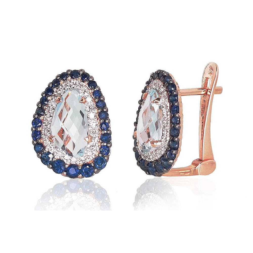Золотые серьги на английском замке, Красное Золото 585°, родий (покрытие), Бриллианты (0,132Ct), Сапфир (0,771Ct), Небесно-голубой топаз (2,7Ct), 3.21 гр.